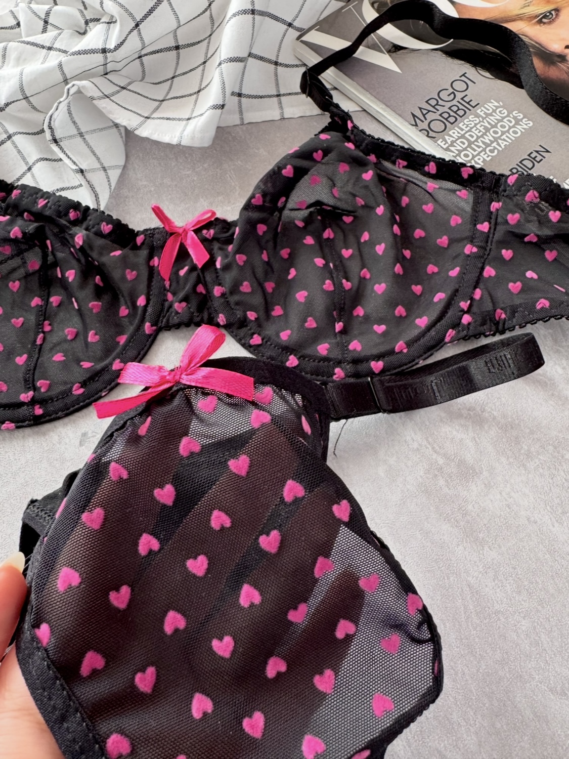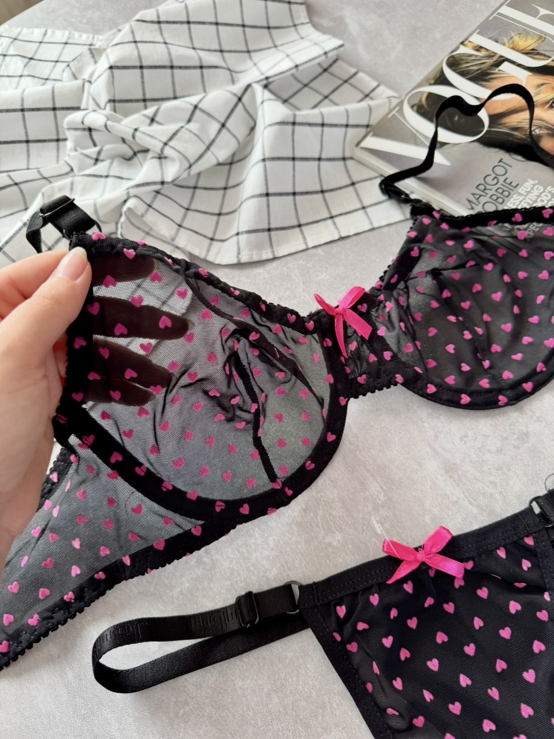 ست تمام تور قلب صورتی🩷🖤 ♥︎جنس تور با قلب های مخملی ♥︎شورت قواره دار و بغل ریگلاژی ♥︎فاق شورت نخی ضد حساسیت ♥︎شورت چون کش میاد تا سایز 48 مناسبه کاپB (استاندارد)
